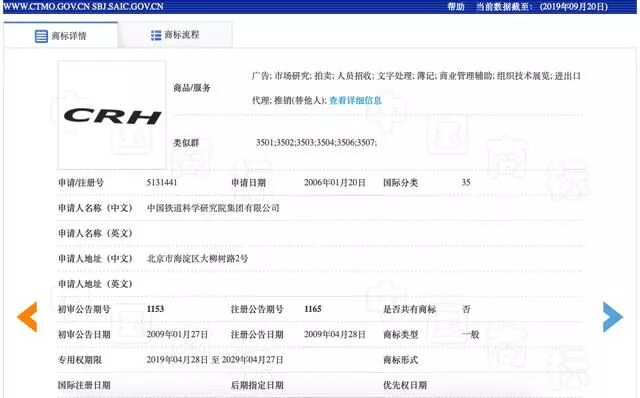 而CRH正是我国高铁的英文缩写,在每辆高铁的白色车身上,我们都能看到明显的“CRH”标志。铁科院作为我国铁路唯一的综合性研究机构,承担着我国高铁的建设、运营、维护工作,高铁“CRH”的商标权也由铁科院享有。铁科院拥有的涉案的第35类“CRH”商标注册于2006年,在2009年4月取得商标专用权。记者查询发现,铁科院共在43个门类上注册了“CRH”商标,本案争议商标则是其中之一。