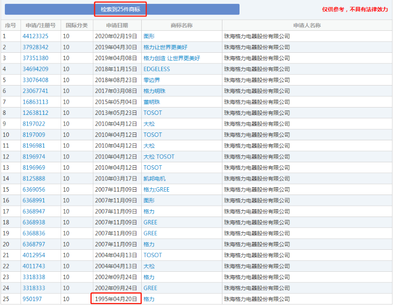 要知道,格力电器成立于1991年,1996年11月在深交所挂牌上市的。从公司成立到上市之间的5年时间,格力一步步加强商标布局和保护,名下商标几乎全类别覆盖。