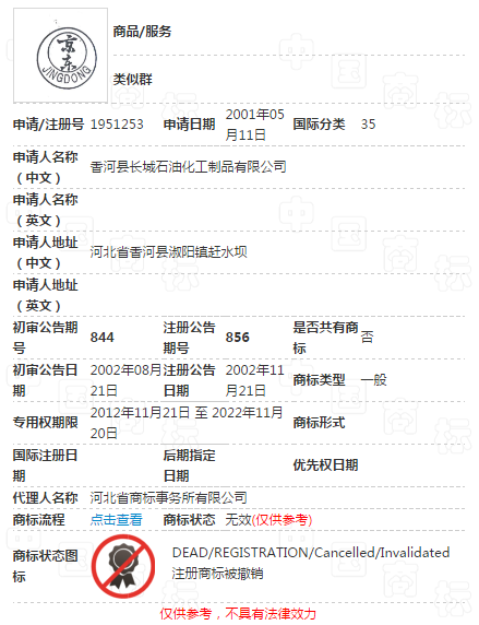 2004年,京东开始从实体店迈入电子商务的浪潮中。众所周知,想要进行电子商务方面的业务,就必须申请35类商标,京东也是如此。谁知道申请却连连被拒,原因在于2001年,香河长城公司早已申请注册了“京东”商标第35类。