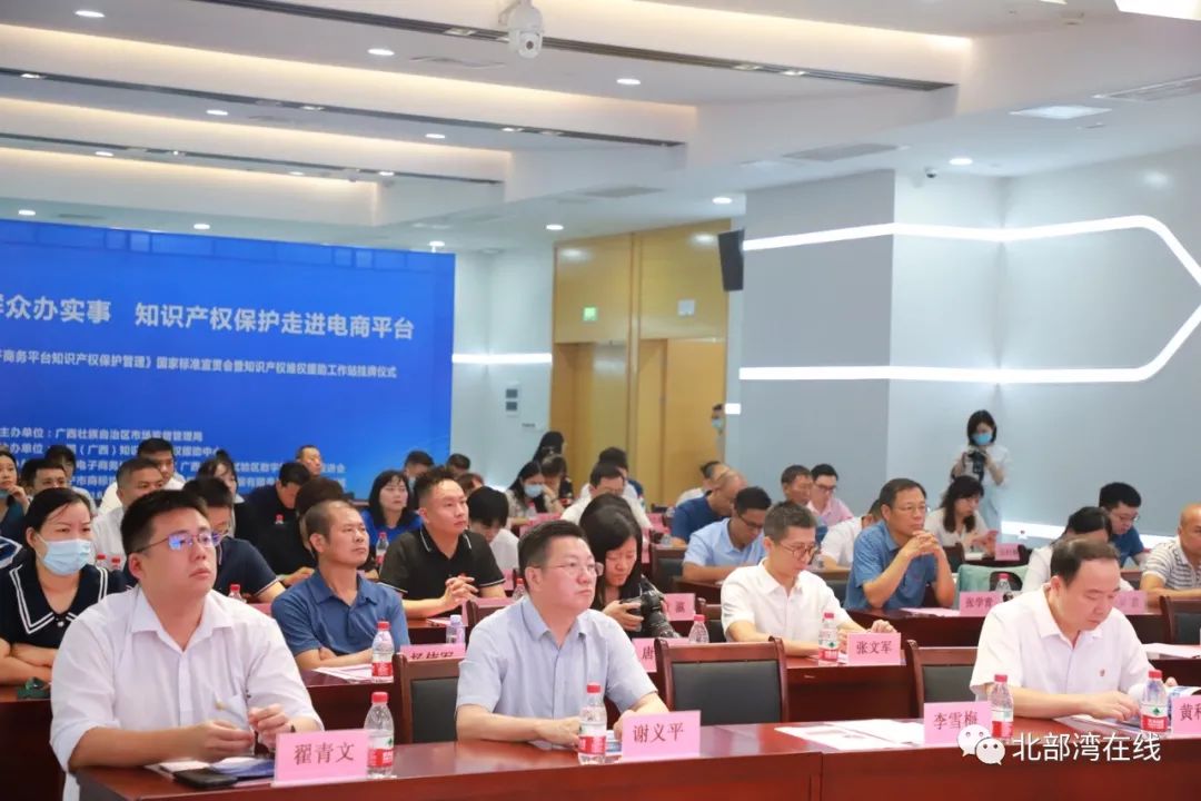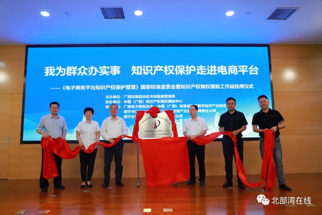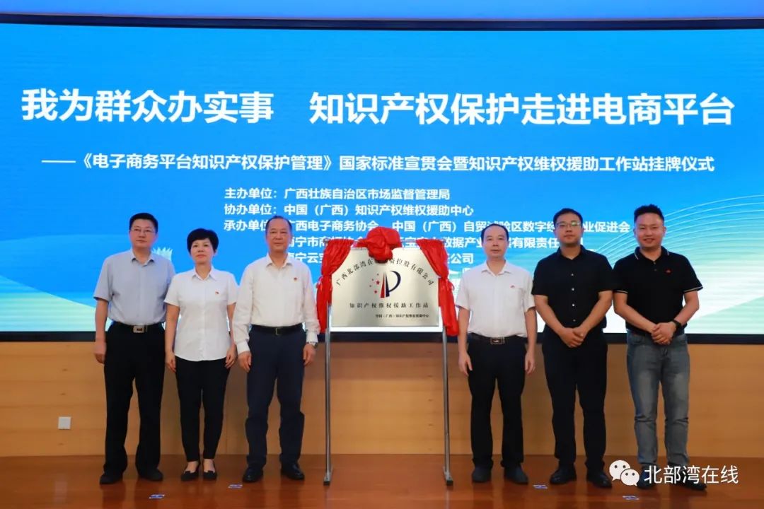 随后,自治区市场监管局、中国(广西)知识产权维权援助中心、自贸区南宁片区新经济发展局,南宁市市场监管局等负责人共同为广西北部湾在线投资控股有限公司维权援助工作站举行了揭牌仪式。