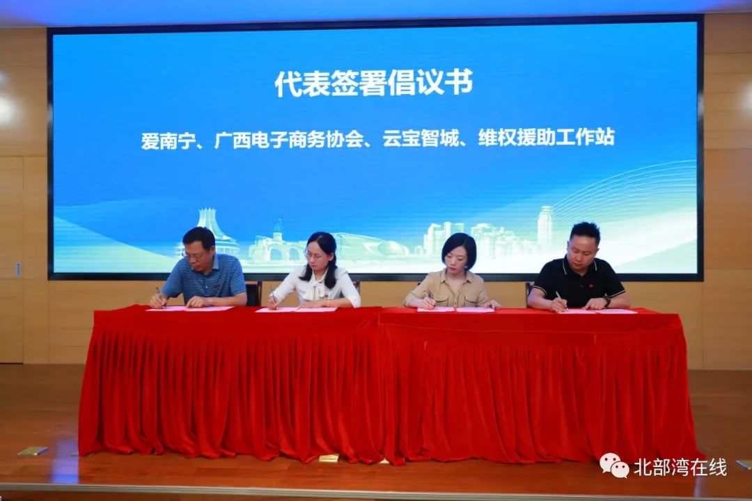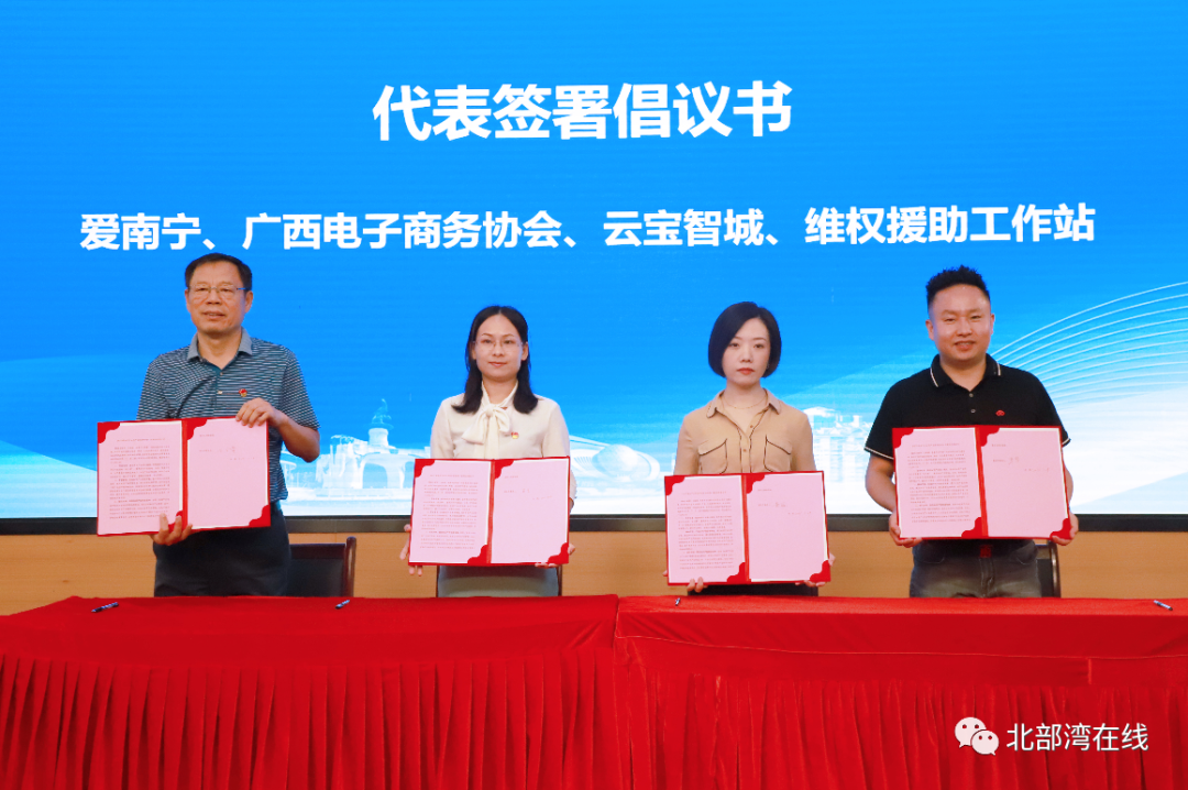 爱南宁、云宝智城、协广西电子商务协会、广西北部湾在线投资控股有限公司维权工作站作为电商平台、商务、协会、工作站四方代表上台一同签署倡议书,同时,与会代表共同使用电子二维码签署了倡议书。